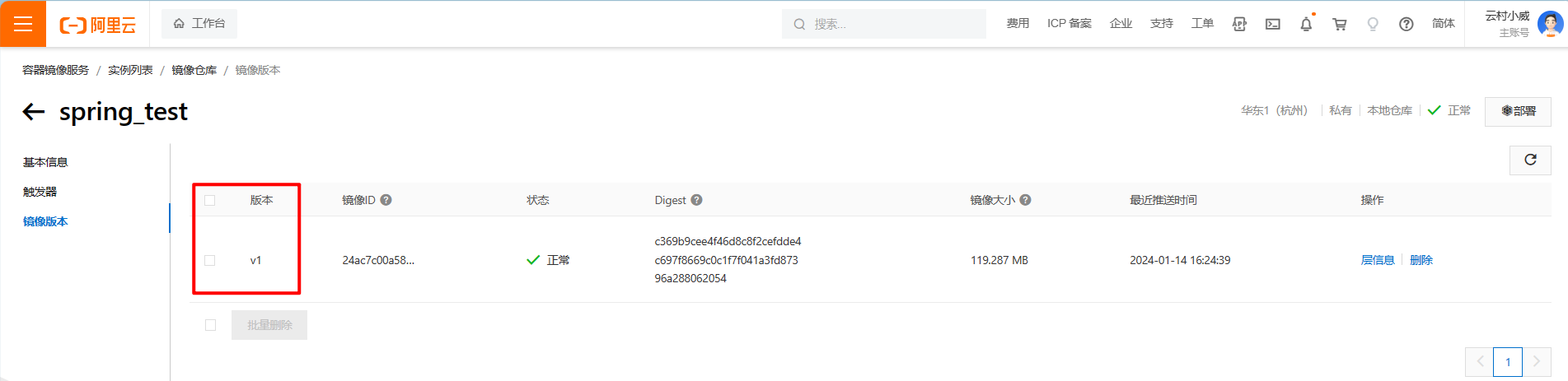 docker pull registry.cn-hangzhou.aliyuncs.com/ycxw3两0/spring_test:v1 [镜像版原号]