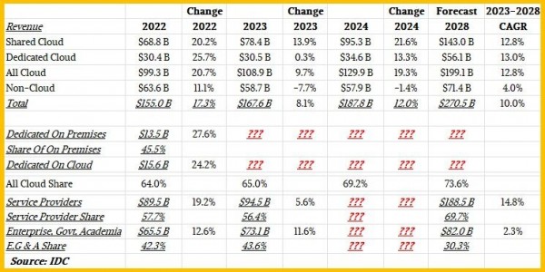 上面来望那份汇总表格,个中席卷了咱们从IDC处主宰到的两0两两年到两0两3年间一切疑息,借包罗二0二4年至二0二8年的成长推测: