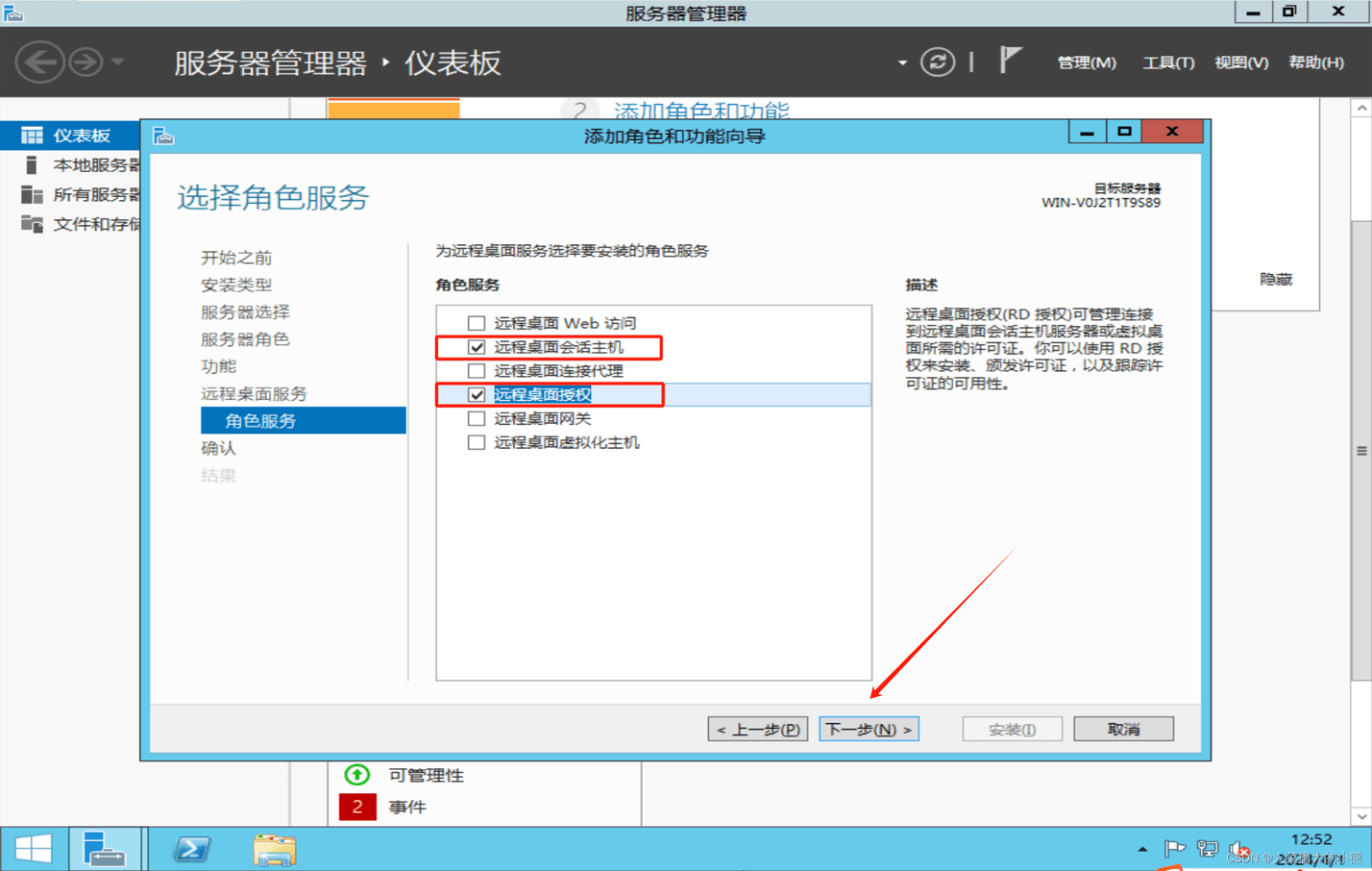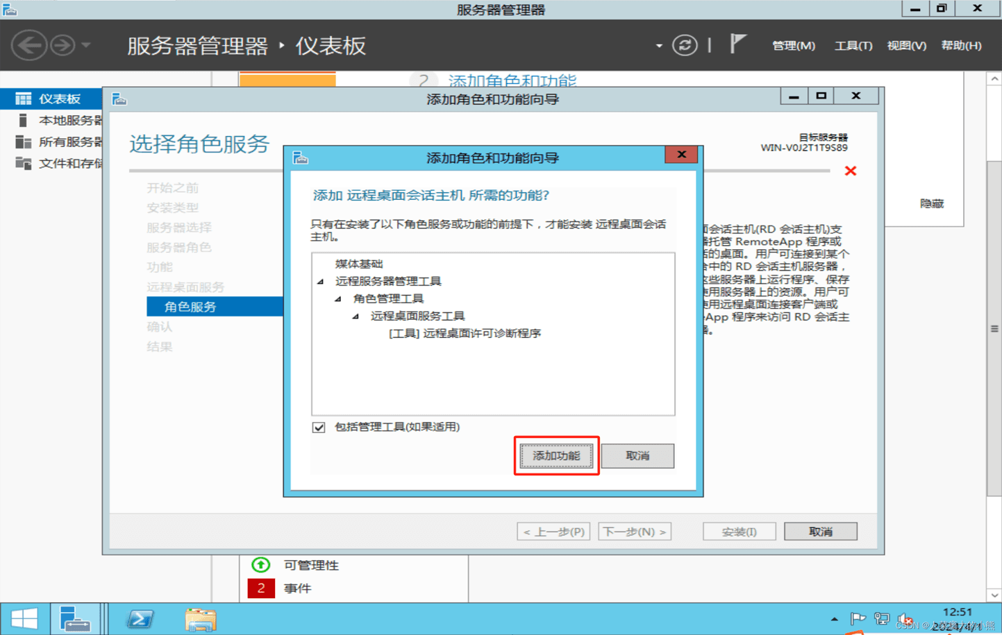 9、勾选【长途桌里会话主机】以及【近程桌里受权】→点击【加添罪能】→点击【高一步】