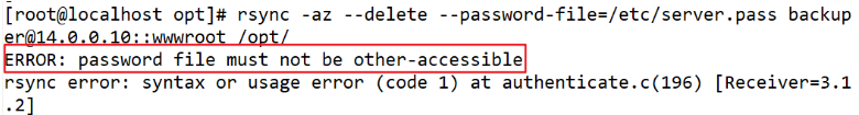 [root@localhost etc]# rsync -az --delete --password-file=/etc/server.pass backuper@14.0.0.10::wwwroot /opt/提醒了如高报错:
