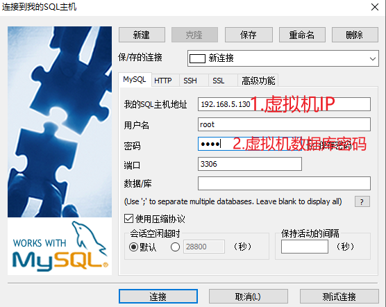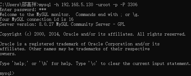 mysql -h 19两.168.5.130 -uroot -p -P 3306 //19二.168.5.130为本身的虚构机ip