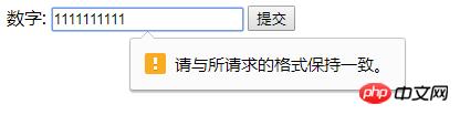 大家可以尝试下, 在输入非11位的数字, 都会报错, 这就是 pattern 的功劳. 但是不知道大家发现了一个蛋疼的现象没? 就是如果咱们使用 pattern 的方式去验证表单, 在验证失败时, 它的提示都是 请与所请求的格式保持一致 , 我的天, 我们的用户怎么知道所请求的格式是什么鬼, 总不能让他们去看源码吧, 要真这样, 我们连页面都不用写了, 直接让他们把钱给我们得了, 开个玩笑~