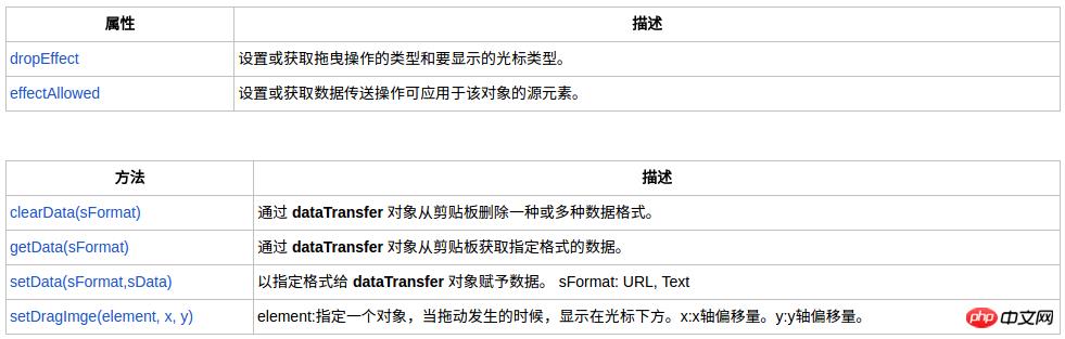 这里首字母大写了,严格说叫做一个类,每一次拖放会实例化这个类,保存在事件对象的dataTransfer属性中。其属性和方法见下表(来自:http://www.cnblogs.com/ijjyo/p/4316232.html)