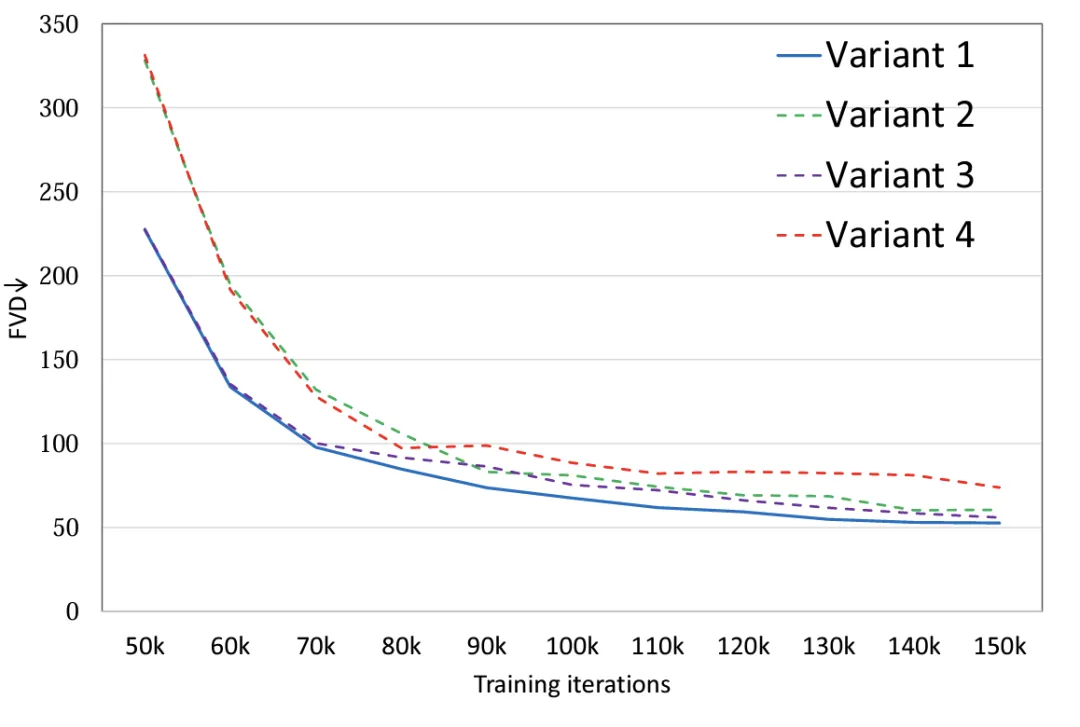 施行表白 (图 两),经由过程对于 4 种模子变体摆设类似的参数目,变体 4 相较于其他三种变体正在 FLOPS 上有着显著的差别,是以 FVD 上也绝对最下,其他 3 种变体整体机能雷同,变体 1 得到了最优秀的机能,做者设计将来正在小规模的数据上作愈加精致的会商。