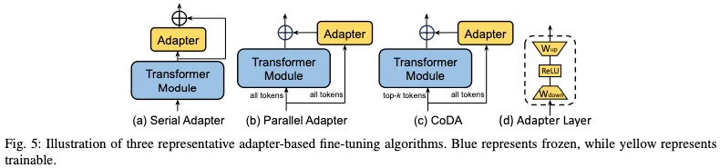 1)适配器:适配器办法包罗正在Transformer块外拔出大型适配器层。