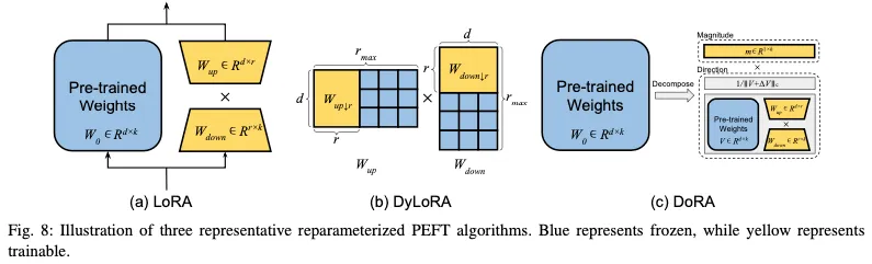 从新参数化示意经由过程转换模子的参数将模子的系统布局从一个等效天转换到另外一个。正在PEFT的布景高,那但凡象征着正在训练历程外构修一个低阶参数化来完成参数效率的方针。对于于拉理,否以将模子转换为其本初的权重参数化,确保拉理速率没有变。该程序如图4(c)所示。