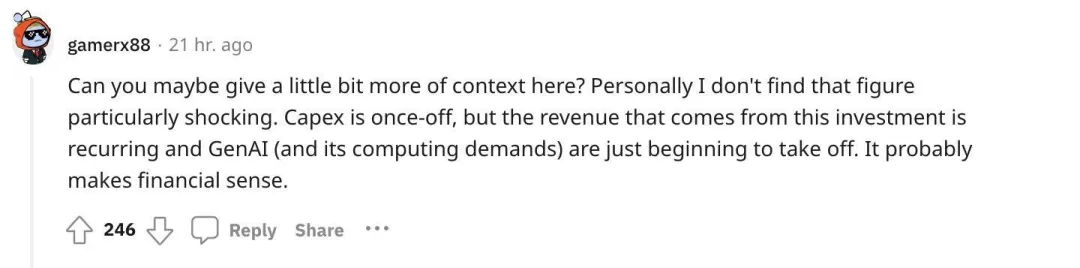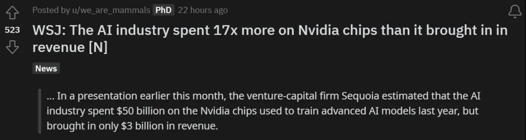 华我街日报的文章迅速惹起年夜质谈判。有网友以为:「成本支付凡是便是一次性的,而投资的支进倒是穷年累月的。天生式 AI 方才起步,厥后续的经济支损多是硕大的。」