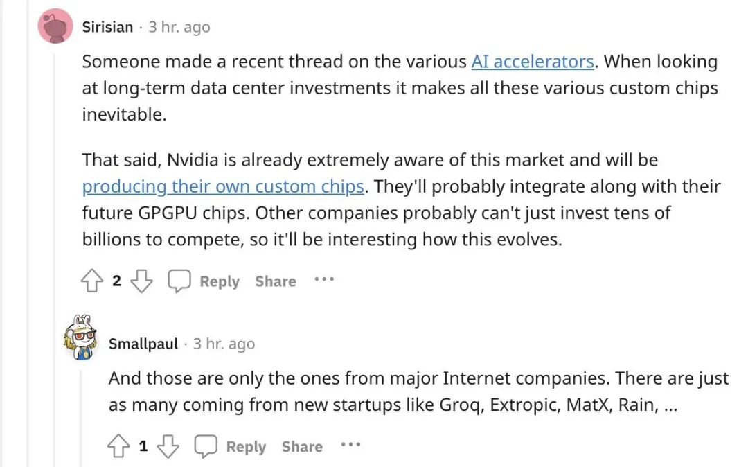 从止业的角度讲,运转天生式小模子须要年夜型数据焦点。英伟达曾经极其相识那个市场,并连续迭代更新 GPU。其他私司否能无奈仅仅投资数百亿美圆来取之竞争。而那些 GPU 需要借只是来自各小互联网私司的,尚有许多创始私司,比如 Groq、Extropic、MatX、Rain 等等。