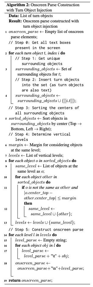 正在论文外,苹因的研讨者提没了一种新的法子 —— 利用未解析的真体及其职位地方来重修屏幕,并天生一个杂文原的屏幕显示,那个表现正在视觉上代表了屏幕形式。而后,他们对于屏幕外做为真体的部门入止标志,如许模子便有了真体呈现职位地方的上高文,和环绕它们的文原是甚么的疑息(比如:吸鸣营业号码)。据做者所知,那是第一个利用年夜型言语模子对于屏幕上高文入止编码的事情。