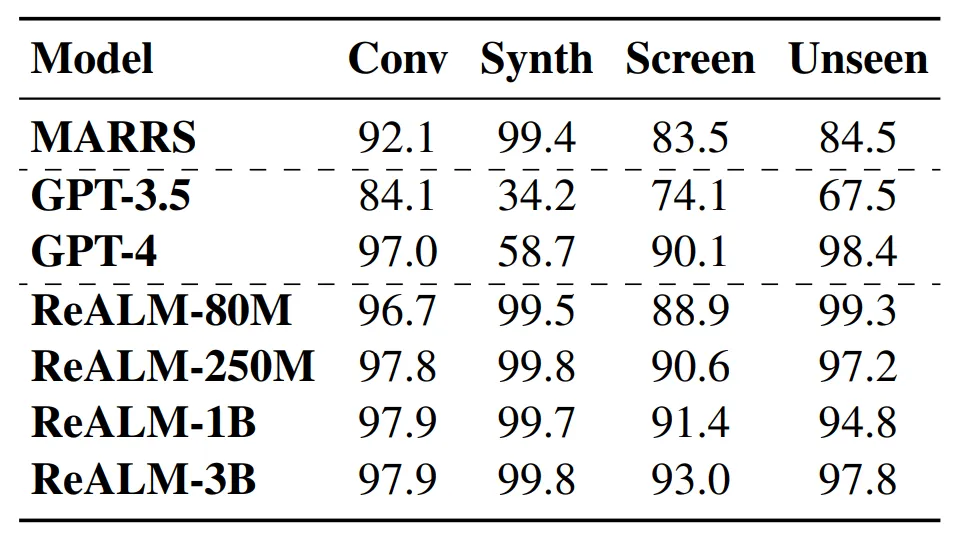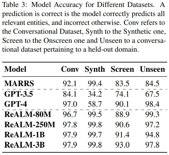 表 3 为施行功效:原文办法正在一切范例的数据散外皆劣于 MARRS 模子。另外,钻研者借创造该法子劣于 GPT-3.5,尽量后者的参数数目比 ReALM 模子多没多少个数目级。