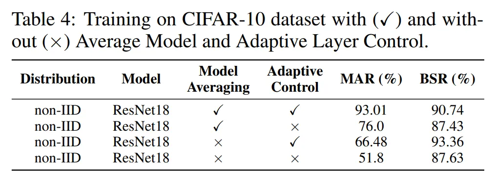 除了此以外,咱们对于模子聚折模块 Model Averaging 以及自顺应节制模块 Adaptive Control 入止溶解施行。如高表所示,那二个模块均对于晋升拔取率以及后门侵犯顺遂率,证实了那二个模块的合用性。