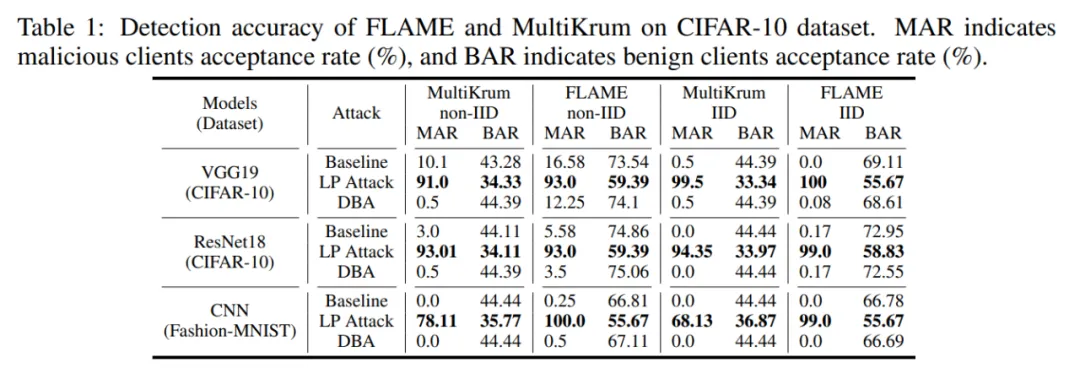 原文对于多个防御办法正在 CIFAR-10 以及 MNIST 数据散上验证了基于后门要害层骚动扰攘侵犯的无效性。施行将别离运用后门突击顺遂率 BSR 以及歹意模子接受率 MAR(良性模子接受率 BAR)做为权衡侵陵无效性的指标。