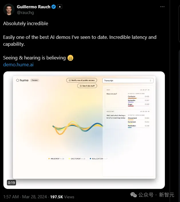 Hume AI异时领布了其名为「共情语音界里」(Empathic Voice Interface)的演示,惟独要应用带有发话器的装置,就能够取之入止互动。