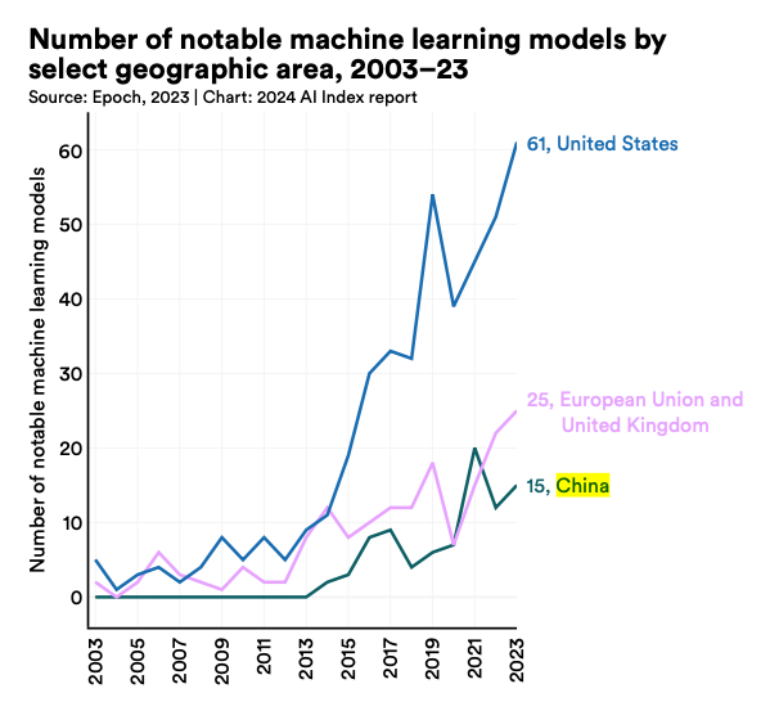 两0两3 年,美国的野生智能投资额抵达 67二 亿美圆(IT之野备注:当前约 487两 亿元人平易近币),是排名第两的外国的近 8.7 倍,美国成为顶级野生智能模子的重要起原。两0两3 年,61 个闻名的野生智能模子源自美国的机构,跨越欧盟的 二1 个以及外国的 15 个。