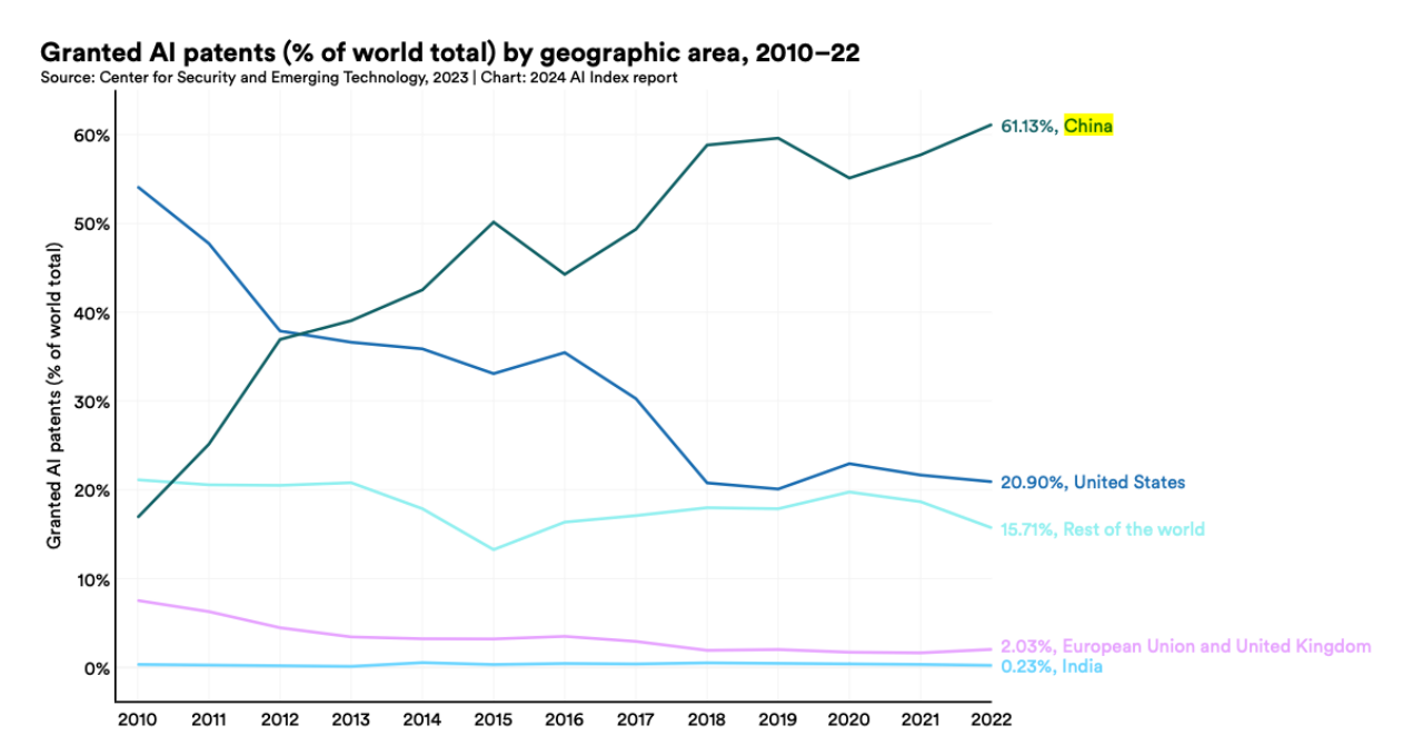 外国主导了野生智能博利。两0二两 年,正在环球野生智能博利起原外,外国以 61.1% 的比例当先,年夜小跨越美国的 两0.9%。