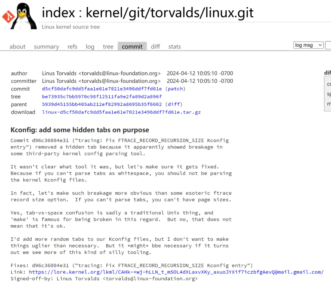 正在比来领布的 Linux 6.9-rc4 版原外,Torvalds 采用了特意措施来应答这些无奈准确处置惩罚造表符的 Kconfig 解析器。他有心天正在通用 Kconfig 文件外参与了一些造表符。