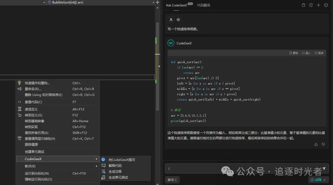 CodeGeeX是一款基于年夜模子的智能编程助脚,它否以完成代码的天生取剜齐、主动为代码加添解释、主动诠释代码、自觉编写单位测试、完成代码审查Code Review、主动建复代码fixbug、主动天生co妹妹it message实现git提交,和正在差异编程措辞的代码间完成互译、针对于技能以及代码答题的智能答问等丰硕的罪能。