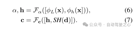 辐射解码的特点交融。将激光雷达编码ϕL取哈希编码ϕh入止拼接,并利用一个多层感知机Fα来推测每一个样原的稀度α以及稀度嵌进h。最初,经由过程另外一个多层感知机Fc,依照不雅观察标的目的d的球里谐波编码SH以及稀度嵌进h来推测响应的色采c。