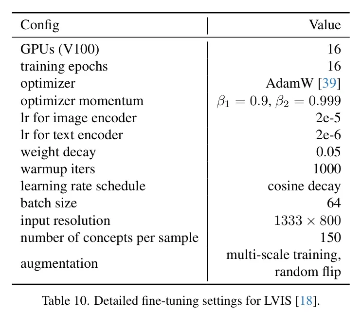 对于于干涸辞汇检测器的训练,遵照先前的DetCLIP任务[58, 60],做者利用FILIP[59]言语模子的参数始初化文原编码器,并正在训练进程外将进修率低落0.1,以生存经由过程FILIP预训练取得的常识。为了前进训练效率,做者将文原编码器的最年夜文原标识表记标帜少度摆设为16。