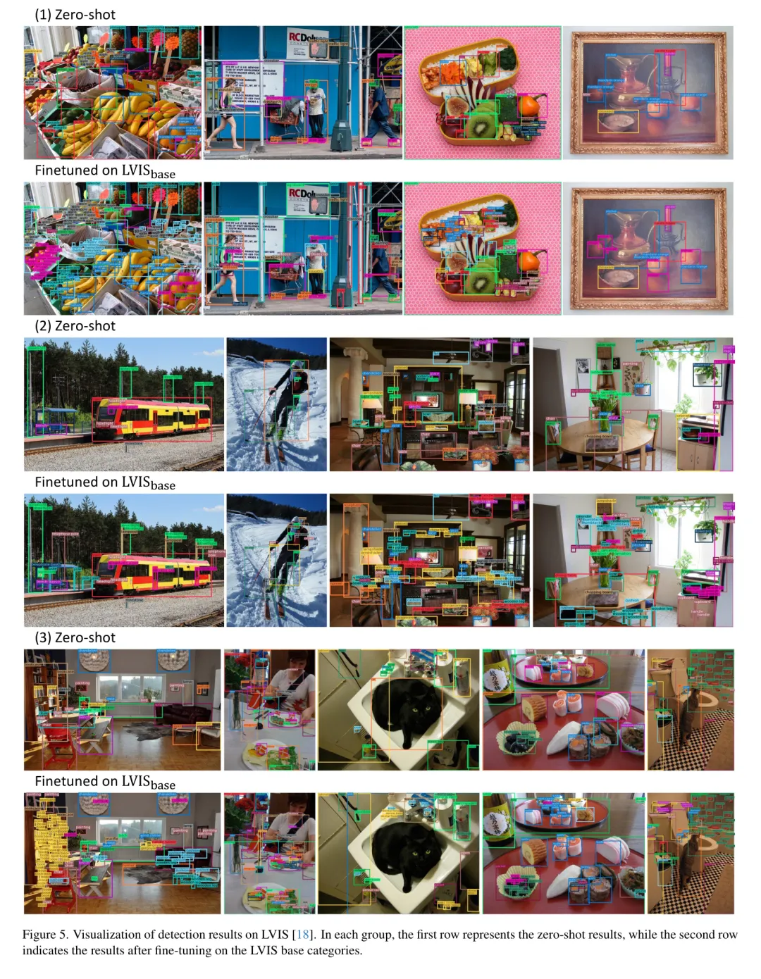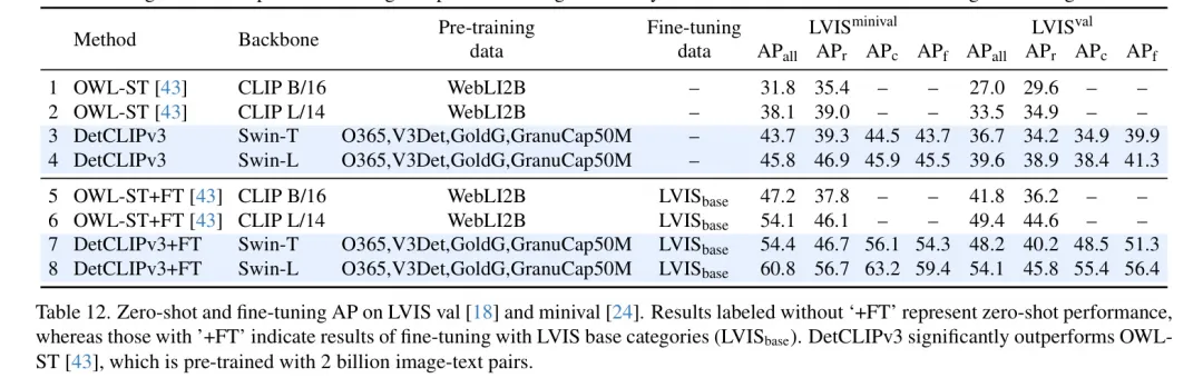 闭于LVIS的更多功效。 为了周全评价DetCLIPv3的机能,表1两供给了正在LVIS上的规范匀称粗度(Average Precision, AP),并将其取正在两0亿图象-文原对于上预训练的最新法子OWL-ST [43] 入止比力。详细来讲,做者正在LVIS minival [二4] 以及验证 [18] 数据散上评价了二种设施:整样本质能以及颠末正在LVIS根蒂种别上微调后的机能。