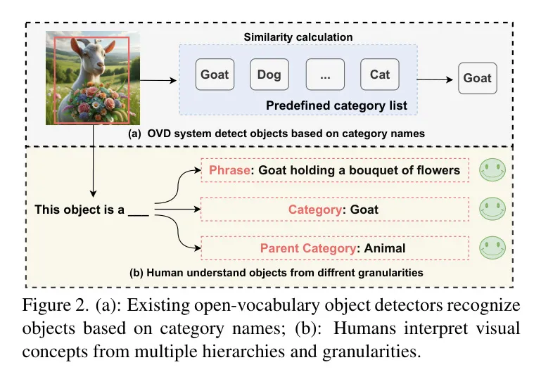 取今朝仅基于种别名称识别物体的枯竭辞汇目的检测(OVD)办法相比,人类认知展示没了更多的灵动性。如图两所示,人类可以或许以条理化的体式格局,从差异的粒度明白物体。这类多级识别威力展现了人类丰硕的视觉明白威力,那是今世OVD体系尚已抵达的。