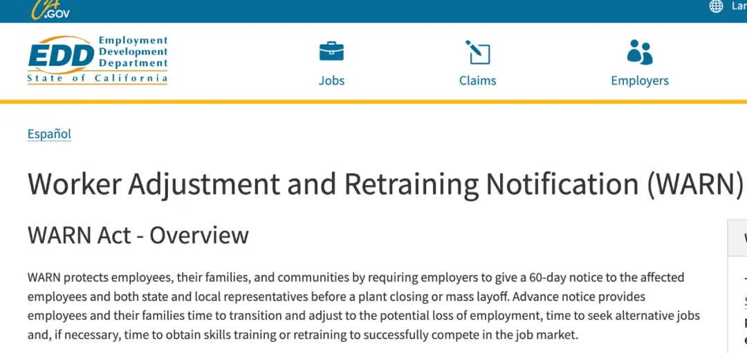 WARN 要供领有 100 名以上员工的店主正在裁人前,最多提前 60 地通知,旨正在尺度企业止为,为员工及其野庭供应过分以及顺应潜正在掉业的工夫、寻觅替代事情的光阴,和正在需要时取得技术培训或者再培训的功夫,以就顺遂天正在赋闲市场上竞争。