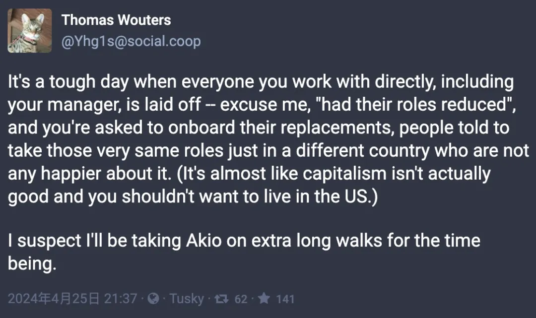 google Python 引导委员会成员 Thomas Wouters 的一条动静让一切人感慨诧异:「当取您间接同事的每一个人,蕴含您的主管,皆被裁人 —— 哦,是职位被减少,而您被要供装置他们的替代者进职,那些人原告知正在差别的国度担当一样的职位,但他们其实不为此感受欢腾,那是很艰巨的一地。」
