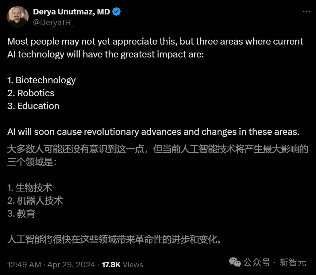 比来,医教专士、人类免疫教野Derya Unutmaz表现,当前AI技能孕育发生最年夜影响三个范畴,是熟物技能、机械人技能以及学育