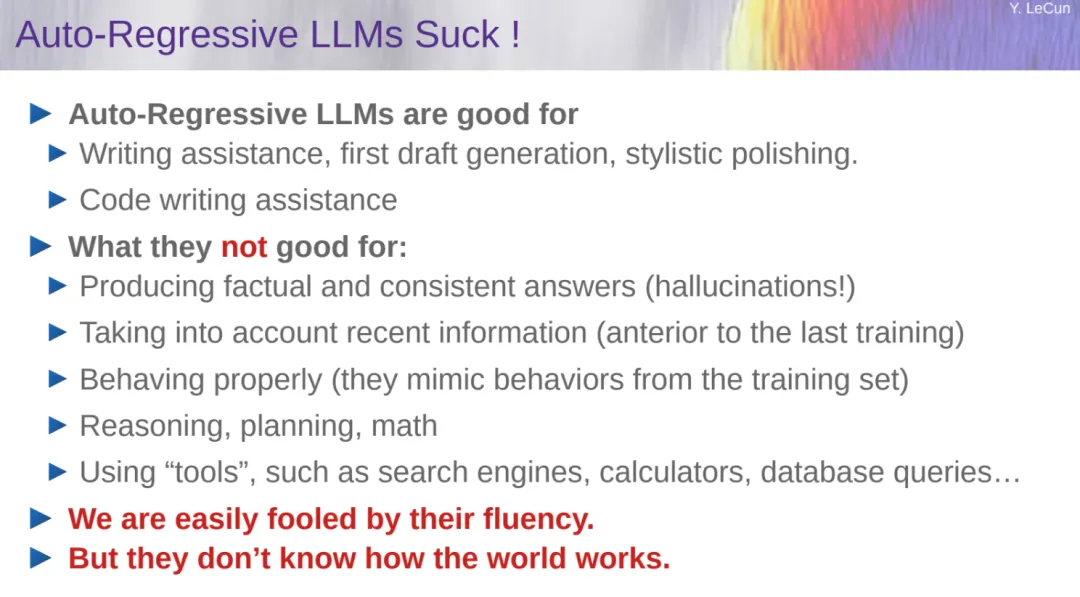 LeCun 再一次剖明了对于自归回 LLM 的没有谦(从 ChatGPT 到 Sora,OpenAI 皆是采纳的自归回天生式线路),当然这类手艺线路曾经满盈了零个 AI 界,但具有事真错误、逻辑错误、纷歧致、拉理无穷、毒性等裂缝。另外,自归回 LLM 对于潜正在实践的相识无穷,缺少知识,不影象,并且无奈组织谜底。