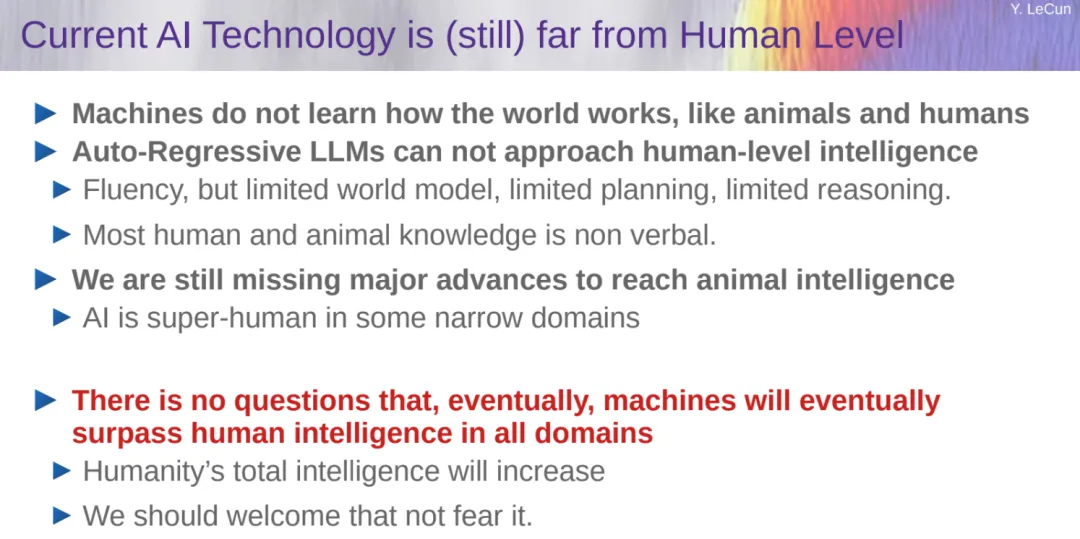 LeCun 以为当前 AI 技能(仍旧)距离人类程度借很遥,机械没有会像植物以及人类这样进修世界的运做体式格局。今朝望来自归回 LLM 无奈密切人类智力程度,即便 AI 正在某些局促的范畴跨越了人类。但毫无疑难的是,终极机械将正在一切范围超出人类伶俐。