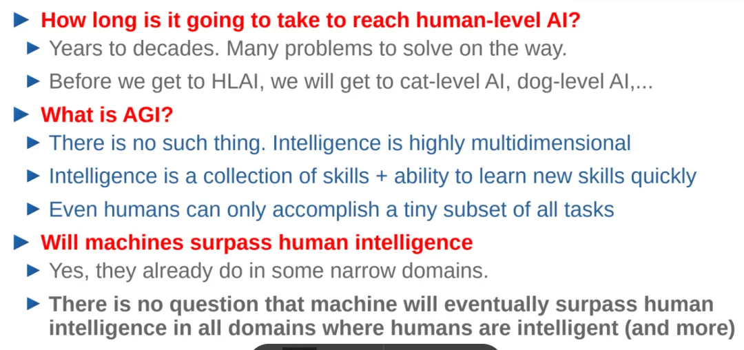 对于于 AGI,LeCun 以为根柢没有具有 AGI,由于智能是下度多维的。固然而今 AI 只正在一些狭隘的范畴凌驾了人类,毫无疑难的是,机械终极将凌驾人类智能。