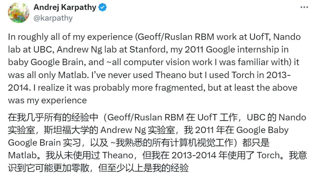 Karpathy 有差异见识,他接话说,年夜多半名目皆是正在用 Matlab ,自身从已利用过 Theano,两013-两014 年运用过 Torch。