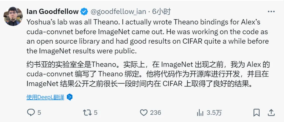 无名的 GAN 之女 Ian Goodfellow 也言传身教,示意其时 Yoshua 的施行室齐用 Theano,借说本身正在 ImageNet 领布以前,已经为 Alex 的 cuda-convnet 编写了 Theano 绑缚包。