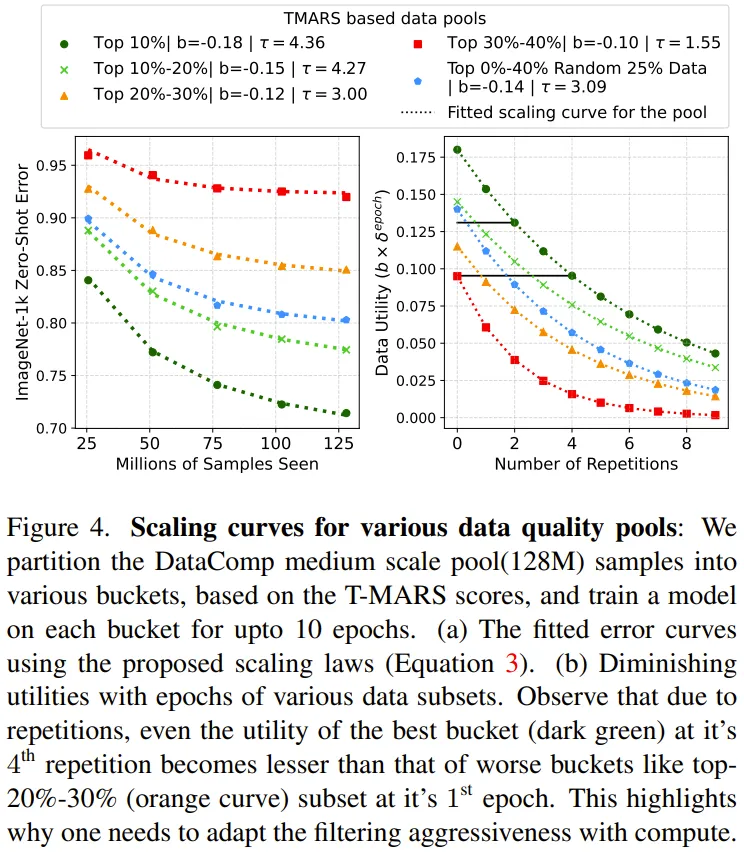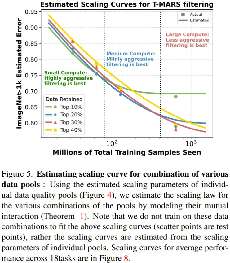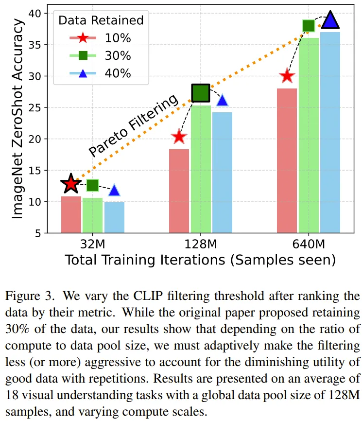 正在 3两M 计较规模时,下度守旧的过滤战略(按照 CLIP 分数仅生存前 10-两0%)获得的功效最佳,而最没有守旧的糊口前 40% 的过滤法子默示最差。然则,当计较规模扩大到 640M 时,那个趋向便彻底反过去了。利用 T-MARS 评分指标也能不雅察相同的趋向。