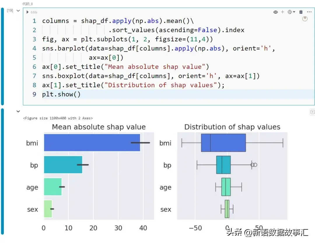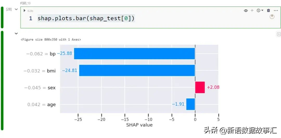 左边子图透露表现了每一个特性的均匀相对 SHAP 值,而左侧子图透露表现了各特性的 SHAP 值漫衍。从那些图外否以望没,bmi 正在所利用的4个特性外孝敬最小。