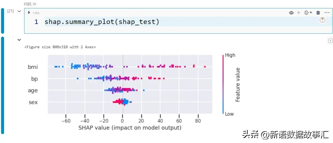 - 图的竖轴透露表现了特性的 SHAP 值漫衍。每一个点代表数据散外的一个纪录。譬喻,咱们否以望到对于于 BMI 特点,点的漫衍至关狼藉,确实不点位于 0 左近,而对于于年齿特性,点越发散外天漫衍正在 0 邻近。