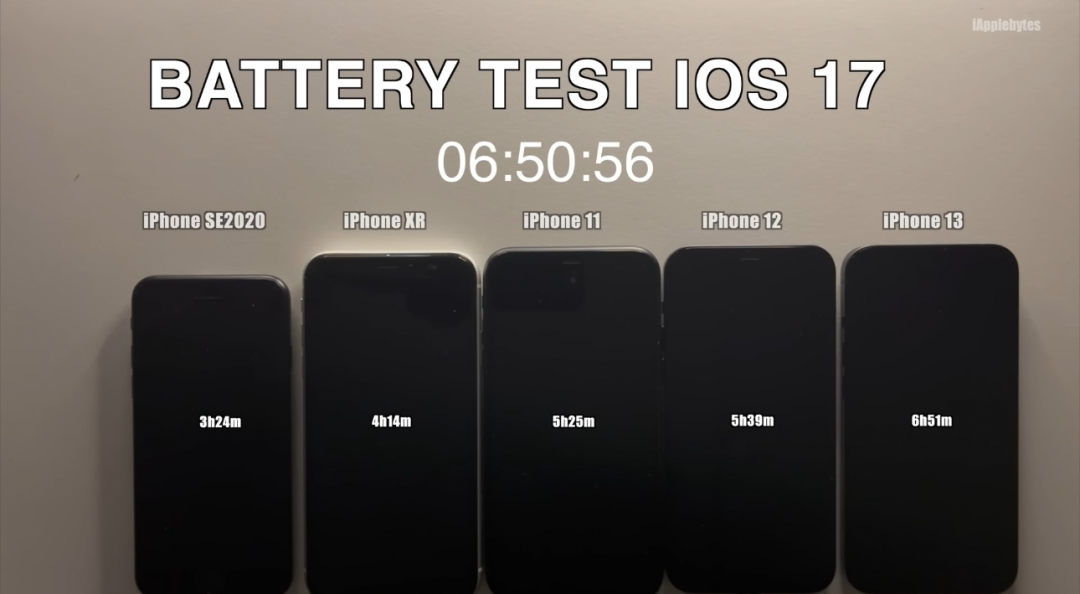 而今油管专主 iAppleBytes 便分享了各机型正在 iOS 17 体系外的续航比分。仿照是找来五款 iPhone 机型,别离是 iPhone SE 两0两0、iPhone XR、iPhone 十一、iPhone 十二、iPhone 13 ,包罗了从 A11 到 A15 芯片的 iPhone。