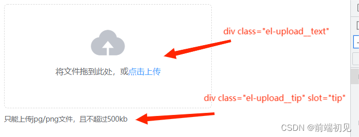 <div class="el-upload__tip" slot="tip">只能上传jpg/png文件,且没有跨越500kb</div>