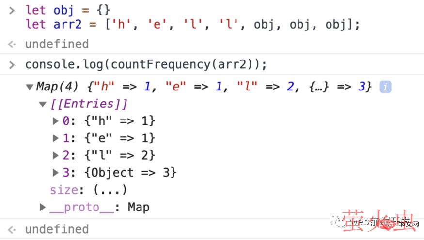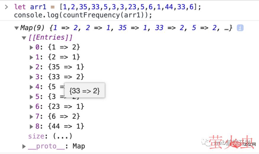 }注意,我们使用map对象而不是对象来存储统计后的频率,因为数组中的元素可能是对象类型,而对象的key只能是字符串或符号类型。