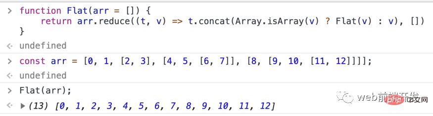 通过reduce依次访问数组中的每个元素。如果我们发现元素还是一个数组,就递归调用 flat 方法。