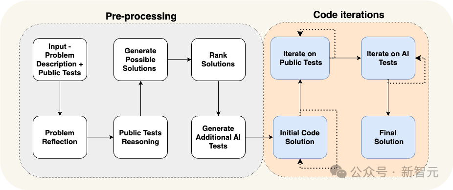 - 预处理阶段是一个线性流程,用自然语言对问题进行推理。在预处理阶段生成额外的数据,如自我反省和公共测试推理,以帮助迭代过程;