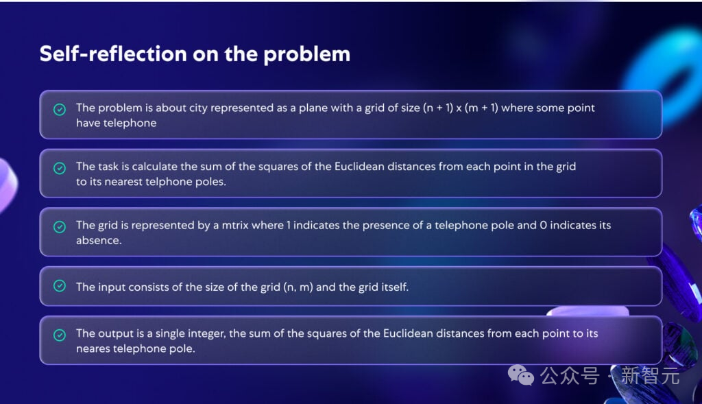 例如,通过对问题的要点进行自我反思(见上图),每个要点代表对问题不同部分的语义理解——一般描述、目标和规则、输入结构和输出结构。