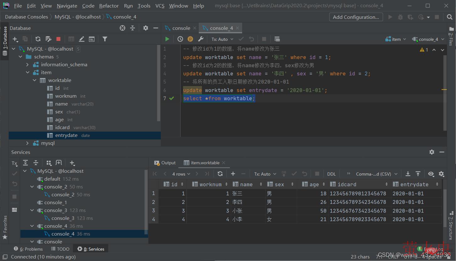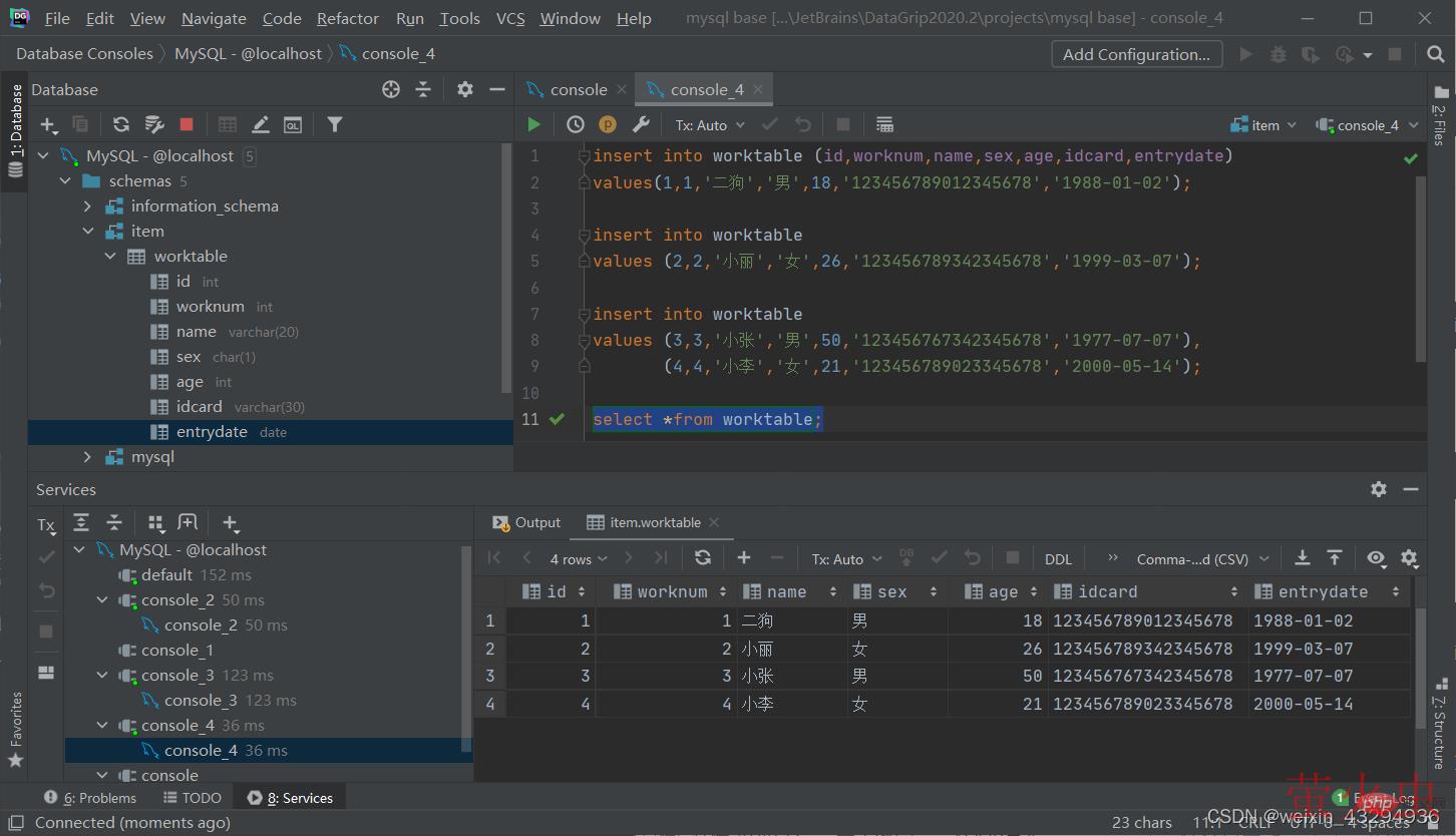 (4,'4','赵敏','女',18,'123456757123845670','北京','2009-12-01'),