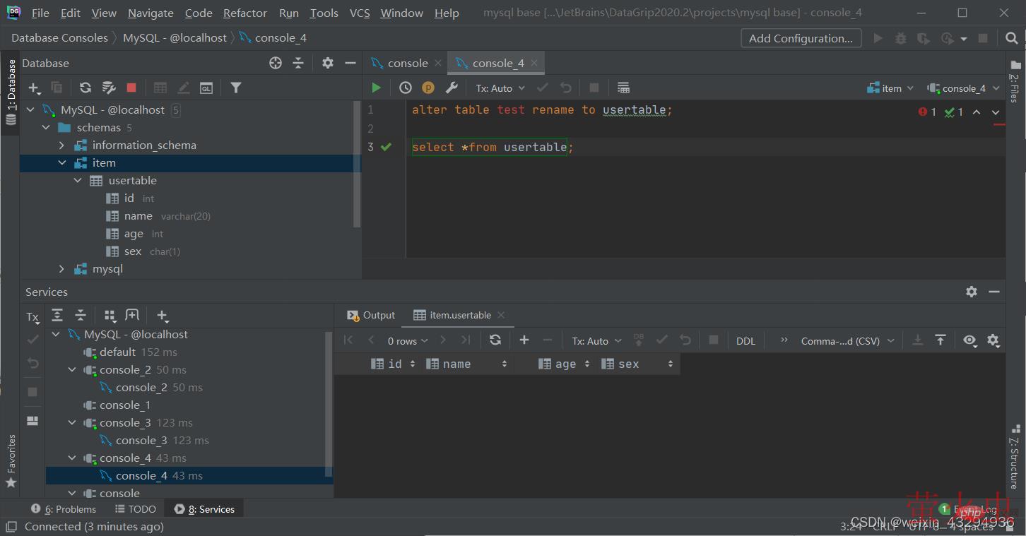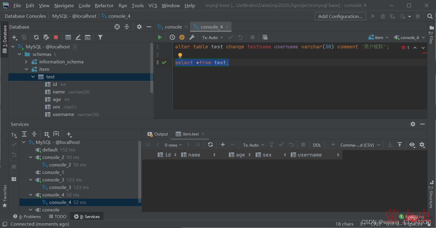 alter table 表名 change 旧字段名 新字段名 类型(长度)[comment 注释][约束];