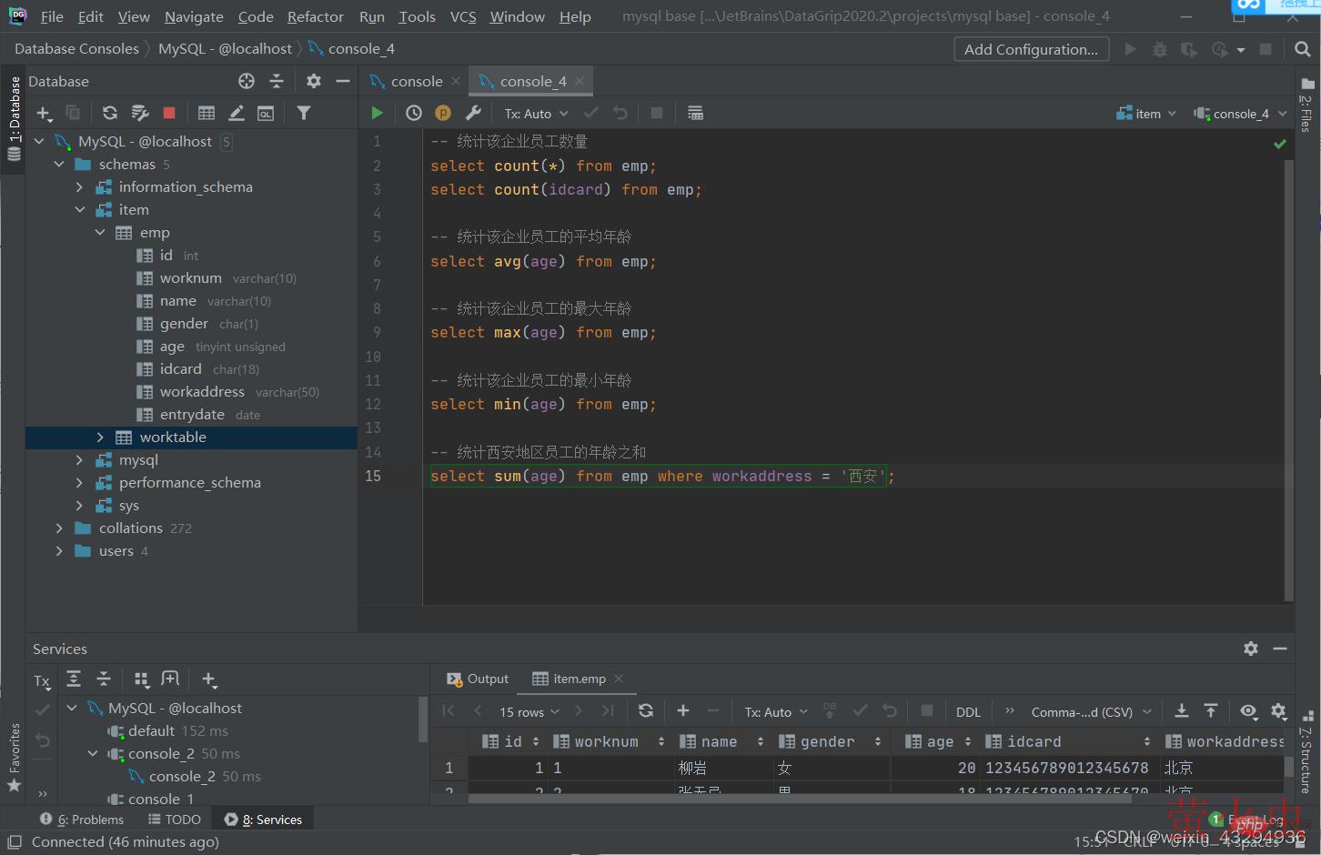create table worktable( id int comment '编号', worknum int comment '工号', name varchar(20) comment '姓名', sex char(1) comment '性别', age int comment '年龄', idcard int comment '身份证号', entrydate date comment '入职日期' )comment '员工信息表';