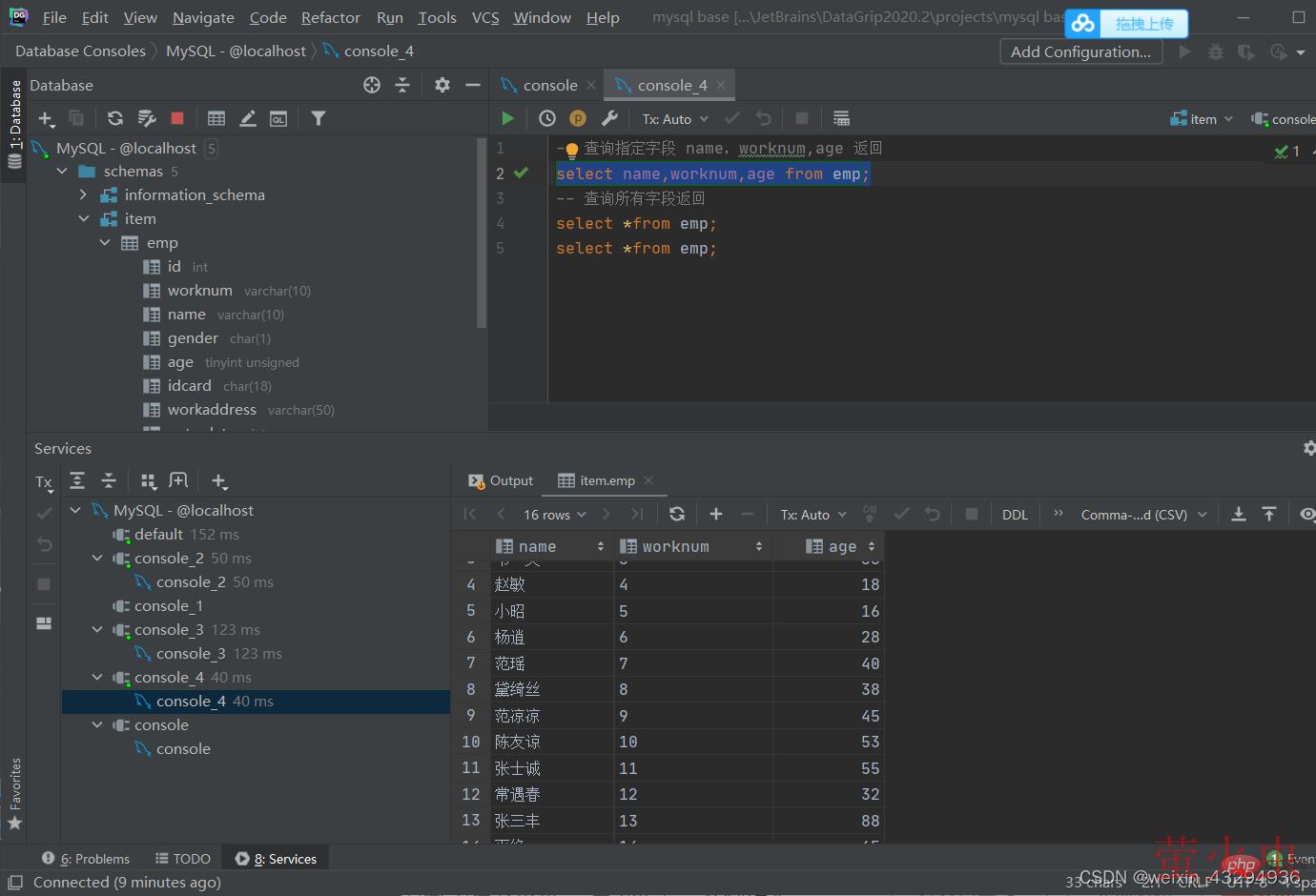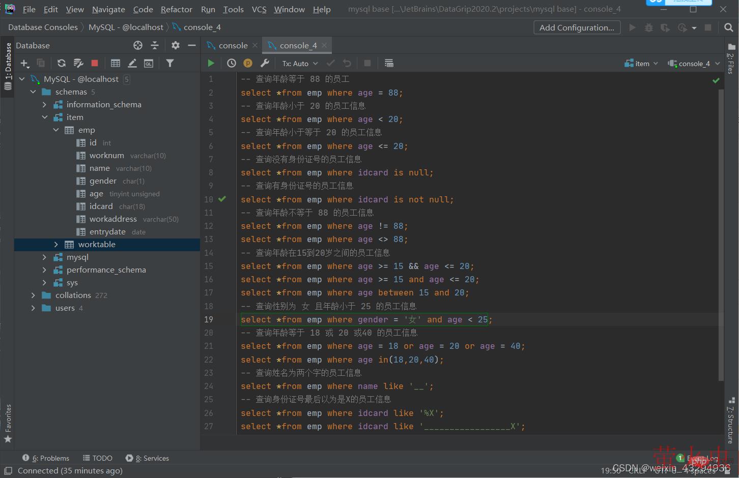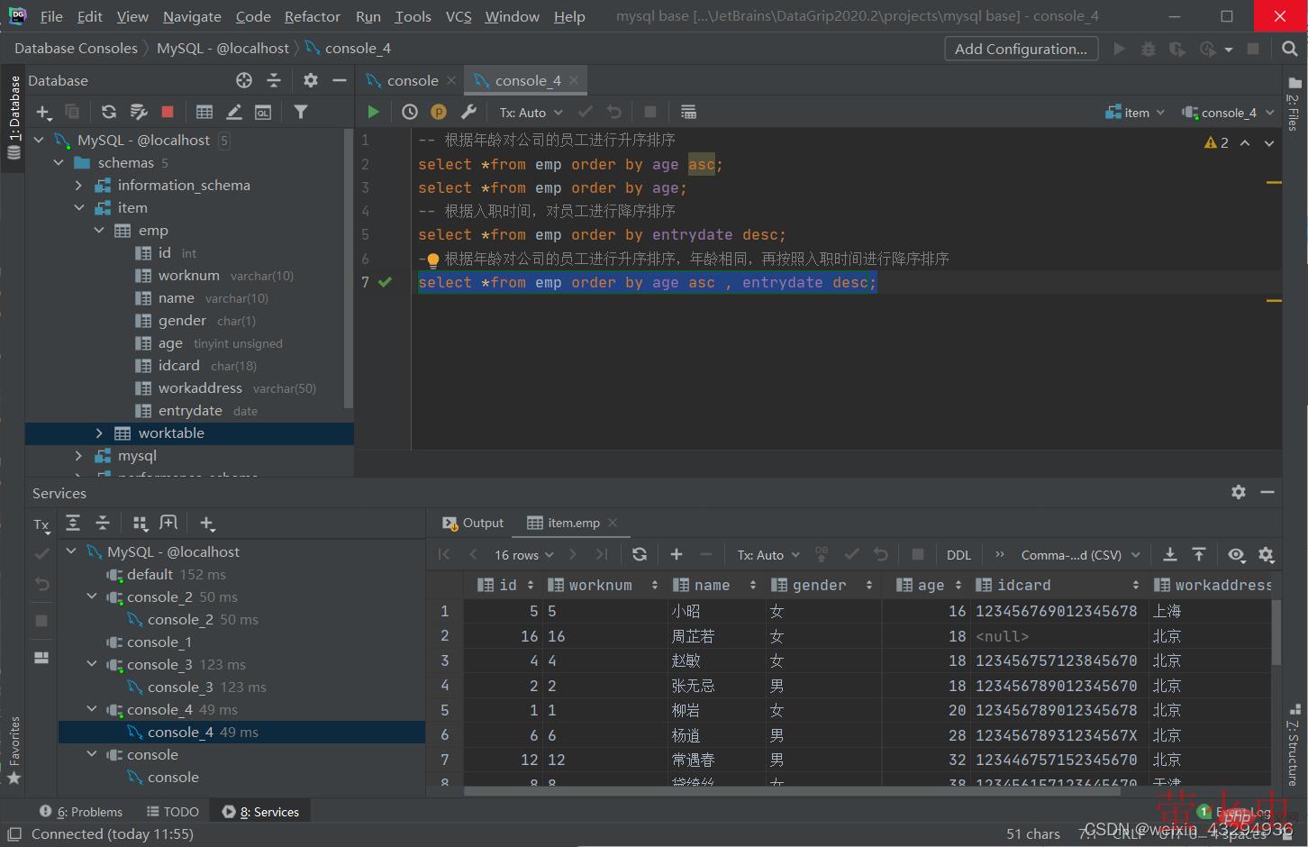 select 字段列表 from 表名 order by 字段1 排序方式1 , 字段2 排序方式2; #排序方式 #asc:升序(默认值) #desc:降序