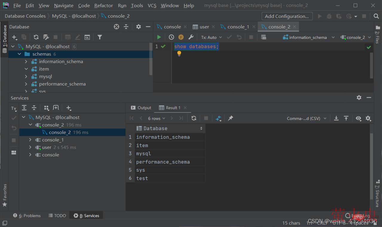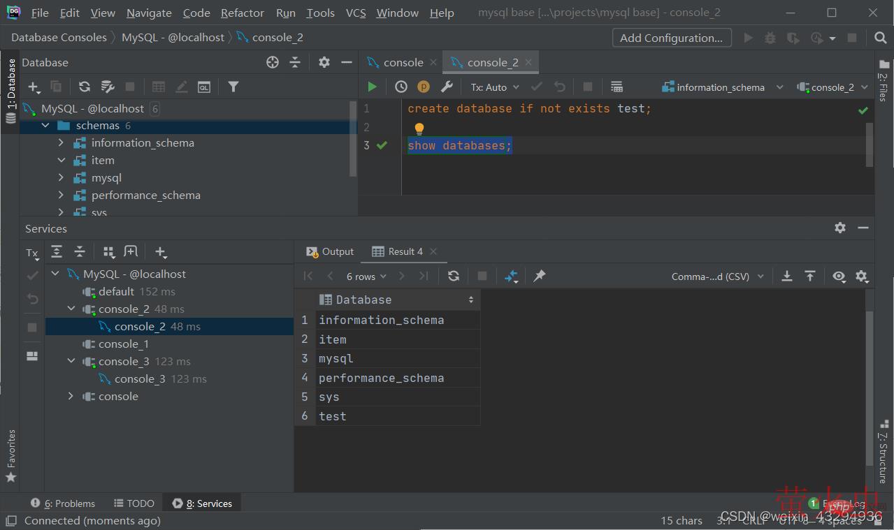 create database [if not exists] 数据库名 [default charset 字符集][collate 排序规则]; #中括号里的可加可不加,具体情况而定 #第一个是如果不存在相同名称的数据库则创建 #第二个是设置字符的字符集和排序规则