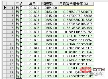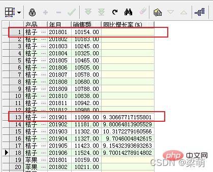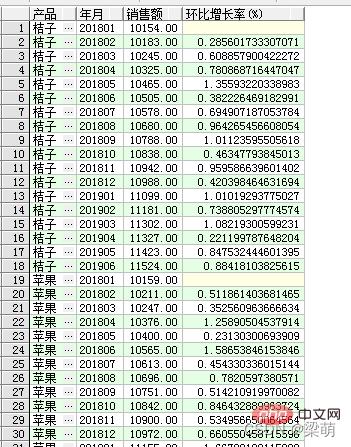 2018年的12期数据都没有对应的同比增长率,“桔子”2019年1月的同比增长率约为9.3067%((11099-10154)/10154×100),依此类推。