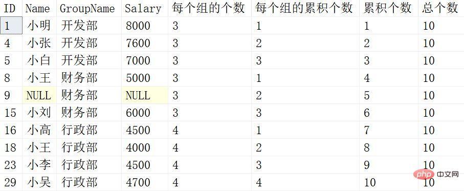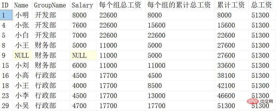 SUM(Salary) OVER(PARTITION BY groupname ORDER BY ID) 每个组的累计总工资,