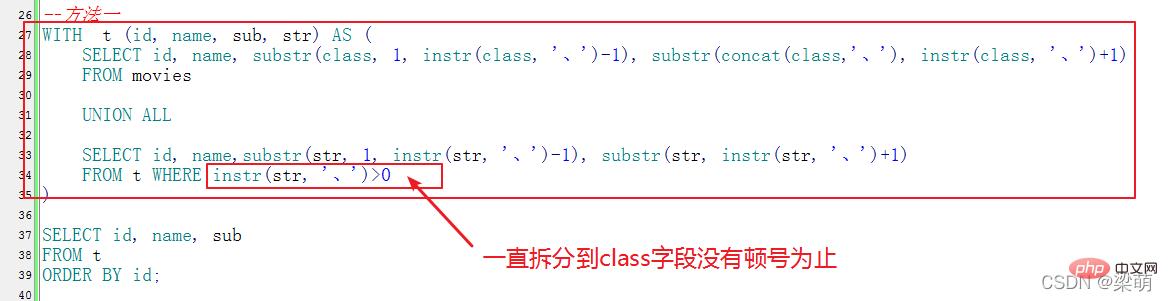 2.第二步利用WITH表达式实现递归查询,根据分隔符(此处为顿号)循环将第一步操作中未拆分的值(第二部分)进行拆分,一直拆分到字段的最后一个分割符为止,递归结束的数据放在临时表t中。
